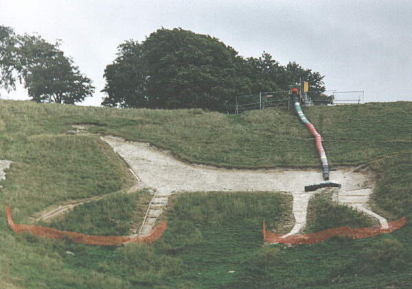 Restoration of the Cherhill white horse. The front legs, neck and body have been recut and lined with shuttering where necessary, and shuttering has been fixed across the rearmost front leg. The rear legs have been filled with new chalk, which is sent down onto the horse by means of the chute from the working platform above. 13 Aug 2002
