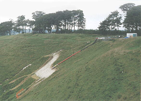 Restoration of the Cherhill white horse. A working platform has been erected above the horse, and a chute installed to send chalk down onto the horse. Work is under way to recut the outline of the horse, and to fit shuttering where necessary to hold the new chalk in place, before re-chalking the horse. 8 Aug 2002