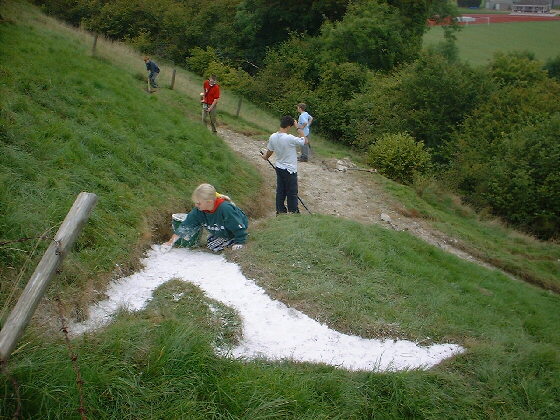 Scouring of the Marlborough white horse by the 2nd Marlborough Scouts on September 22nd, 2001. Pure calcium carbonate (chalk) mixed with water is being applied to the surface.