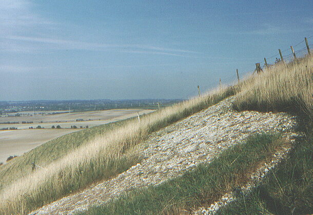 The body and tail of the Pewsey white horse. The steepness of the slope can be seen.