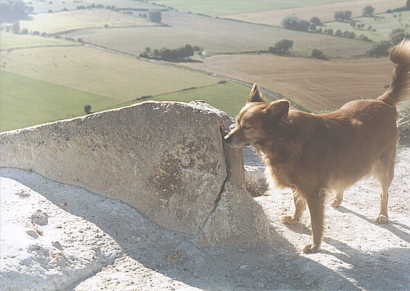 The tip of the ear of the Westbury white horse projecting over the path, viewed from above.